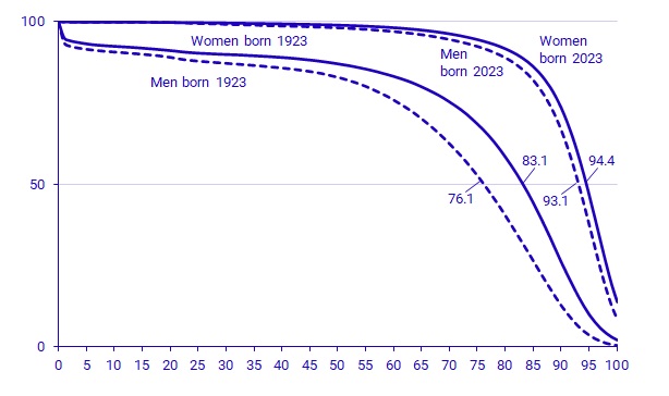 In 2022, the Swedish government produced a lifespan projection, comparing people born in 1923 to those born in 2023. For people born now, they are estimating that ~20% will make the century mark. This is a healthy number, but not near what I suggested.